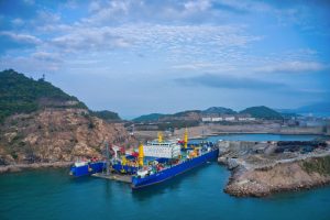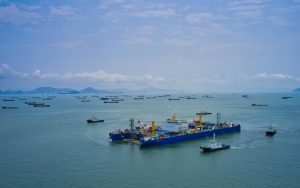 沉管運輸安裝一體船正提帶E18管節,準備出發前往隧址處