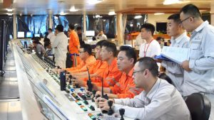 深中通道建設者在船艙內,進行E18管節沉放安裝作業