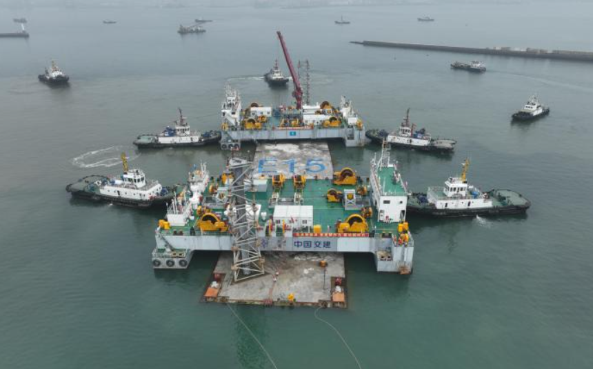 11日上午6時,浮運安裝工作正式啟動,在先后完成拖輪編隊、浮運、系泊、沉放、拉合、水力壓接等工序后,于11日19時26分順利完成與E14管節的對接,用時約13.5個小時。經測控系統顯示,E15管節安裝精度滿足設計要求。