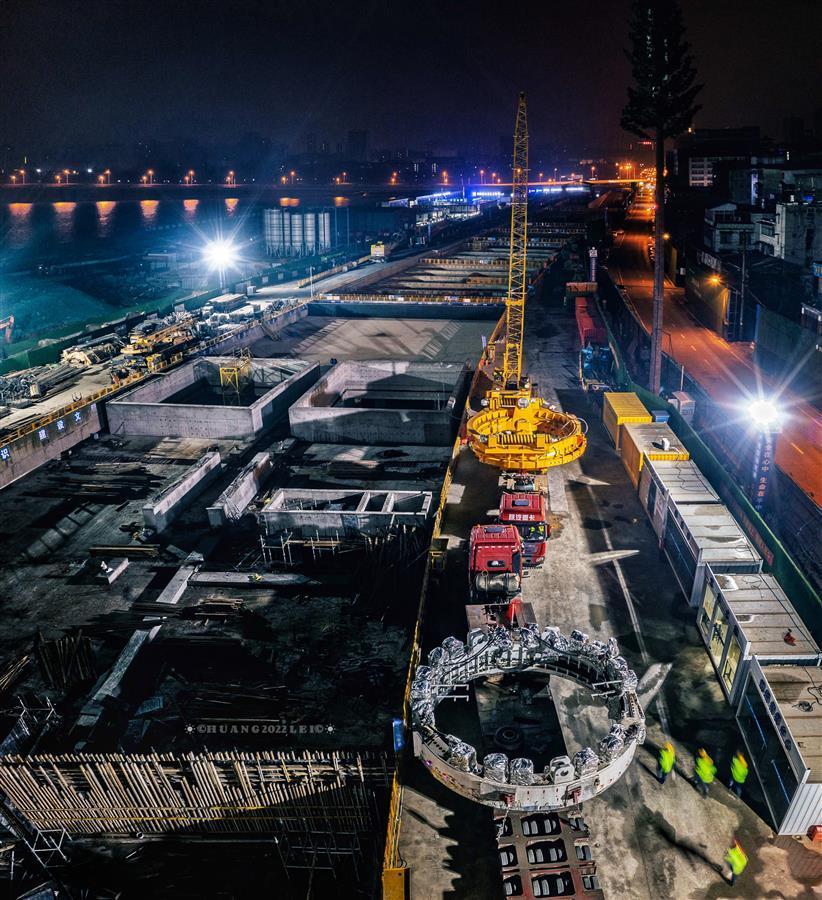 5月15日,武漢東湖風光村工作井工地上,機器轟鳴,吊車搖臂,一片繁忙,直徑15.094米的“東湖號”盾構機車架徐徐下井,主機正有序組裝。
