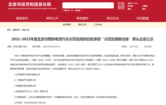 2022年5月6日,北京市經信局發布了《2021-2022年度北京市燃料電池汽車示范應用項目擬承擔“示范應用聯合體”牽頭企業公示》,公示了承擔示范應用項目的4家牽頭企業,分別為:宇通、海格、福田歐輝、一汽解放(排名不分先后)。