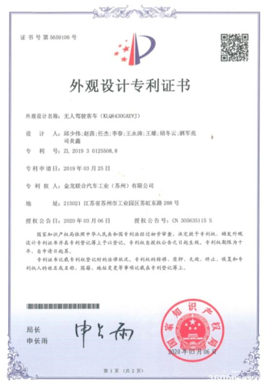 近日,國家知識產權局發布第二十三屆中國專利獎評審結果,蘇州金龍海格客車參選的無人駕駛客車“深藍”從眾多參選專利中脫穎而出,當選中國外觀設計銀獎(預獲獎)!