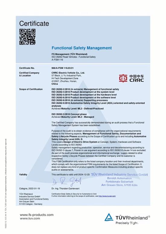 其實,早在2017年4月,中車電動便正式成立功能安全管理體系認證項目團隊,負責功能安全管理體系建設、功能安全產品開發及相關認證工作,并于2018年,獲取ISO26262功能安全管理體系ASIL-D ML2-管理級認證證書。