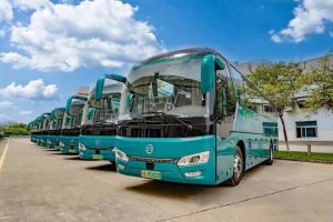 五月的廈門,盛夏的驕陽還未到來,火紅的鳳凰花已在街頭巷尾次第盛開,為這座海濱城市增添一股明媚的熱情。在廈門金龍旅行車有限公司(下稱“金旅客車”)海滄生產基地,鳳凰花掩映下,新一批金旅純電動旅游大巴正式啟程,奔赴廣州,交付廣州市都城汽車租賃有限公司。