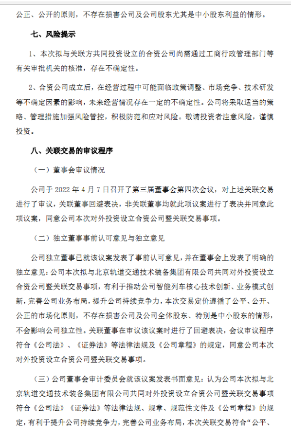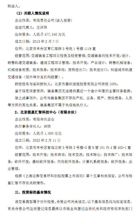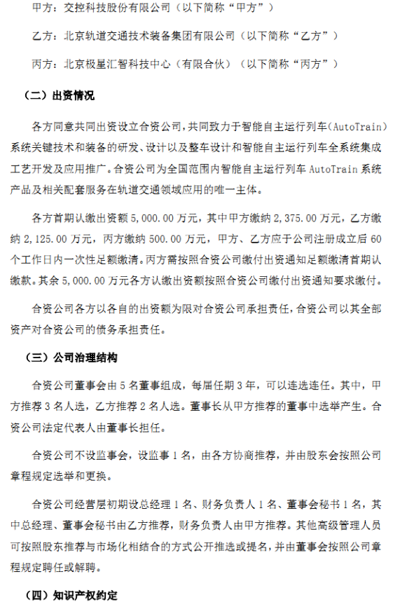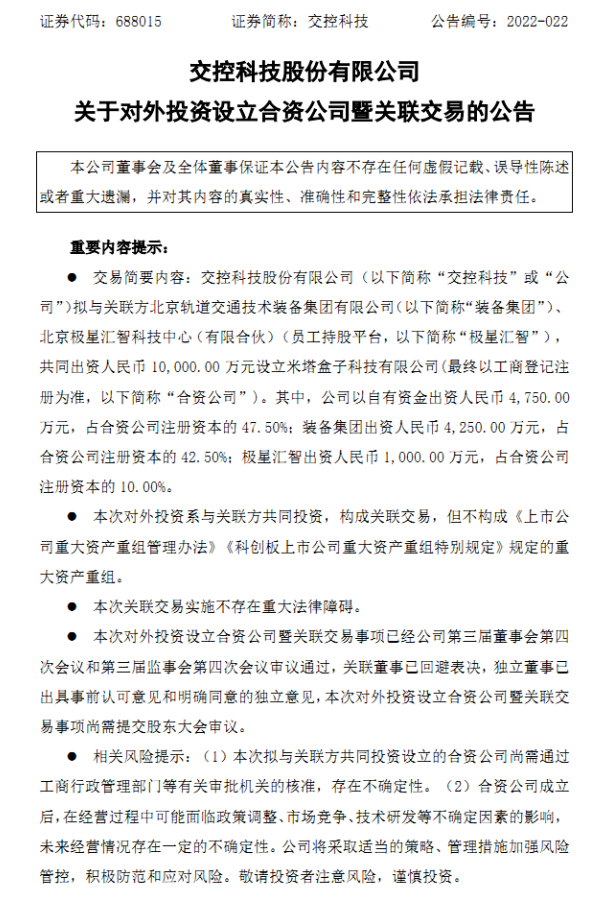 交控科技公告稱為積極拓展新業務模式,提升公司在軌道交通系統領域的產品技術含量及競爭力,擬與關聯方北京軌道交通技術裝備集團有限公司(以下簡稱“裝備集團”)、北京極星匯智科技中心(有限合伙)(員工持股平臺,以下簡稱“極星匯智”),共同出資人民幣 10,000.00 萬元設立米塔盒子科技有限公司(最終以工商登記注冊為準,以下簡稱“合資公司”)。其中,交控公司以自有資金出資人民幣 4,750.00萬元,占合資公司注冊資本的 47.50%;裝備集團出資人民幣 4,250.00 萬元,占合資公司注冊資本的 42.50%;極星匯智出資人民幣 1,000.00 萬元,占合資公司注冊資本的 10.00%。