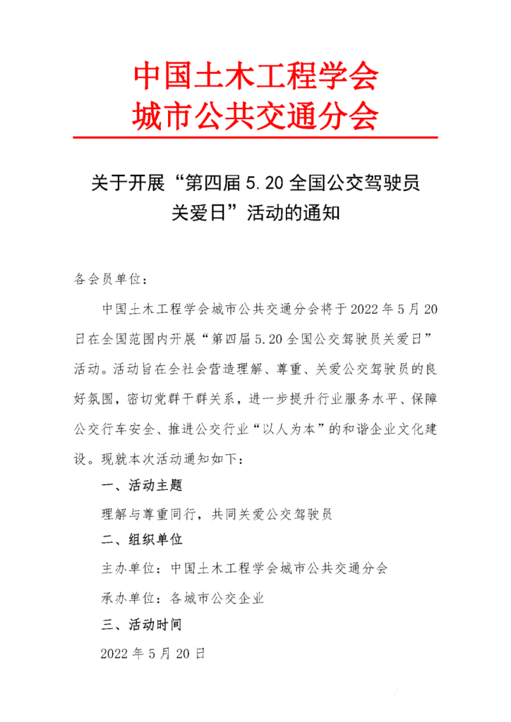 中國土木工程學會城市公共交通分會將于2022年5月20日在全國范圍內開展“第四屆5.20全國公交駕駛員關愛日”活動。活動旨在全社會營造理解、尊重、關愛公交駕駛員的良好氛圍,密切黨群干群關系,進一步提升行業服務水平、保障公交行車安全、推進公交行業“以人為本”的和諧企業文化建設。現就本次活動通知如下: