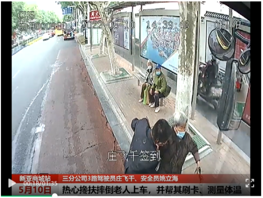 當天14時40分左右,3路駕駛員莊飛千行駛至新亞商城站時,一名拄著拐杖的老人在準備上車時不小心摔倒在地,車廂安全員姚立海見狀立即跑下車,來到老人身邊,將倒地的老人扶起,關切地詢問道:“您沒事吧,需不需要坐下來歇一歇?”老人表示自己并無大礙,并告訴姚師傅她打算乘坐3路公交車。于是,姚師傅一邊扶著老人上車,一邊耐心地提醒道:“您手扶穩,慢一點走,上車后往里走坐下,我幫您刷卡。”駕駛員莊飛千熱情地提醒老人坐在愛心座位,車上的乘客見狀也起身給老人讓座。等姚師傅將老人扶至愛心座位坐好后,莊飛千才繼續投入運營。15時09分,車輛行駛至水渡口大道英才街站,細心的莊飛千發現老人起身準備下車,立即提醒她車輛還未停穩,讓她不要起身走動。姚師傅也立即來到老人的身邊,等車輛進站停穩后,他暖心地將老人攙扶下車,叮囑她路上小心,一定要注意安全,不要再摔倒了,老人感動地連聲道謝。